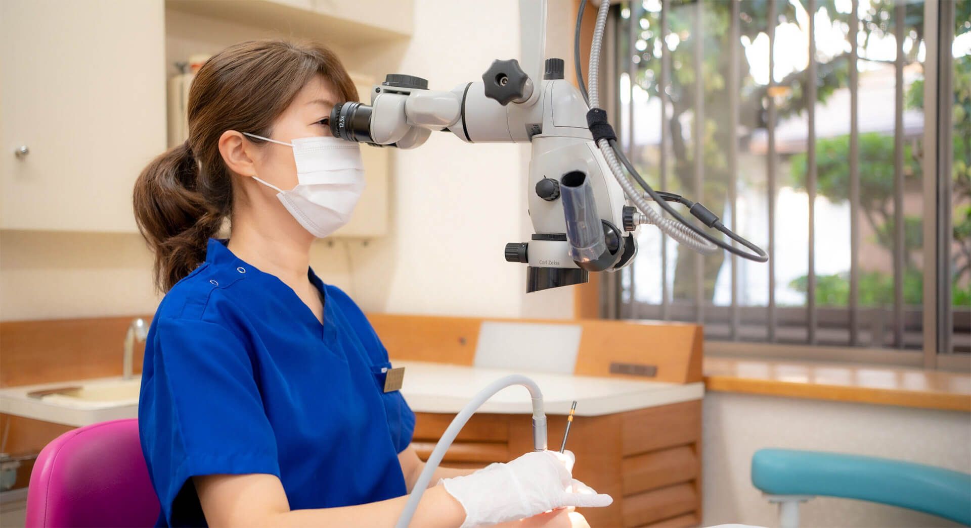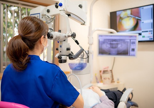 歯科用顕微鏡では歯を約20倍に拡大して見ることや、十分な照明を当てることができるため、明るく安全な状態にて治療ができます。また記録した動画を患者様と一緒に見ながらご説明することが可能です。(一部自由診療)